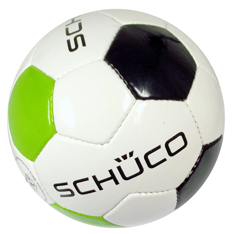 White soccer ball with green and black accents wit...
