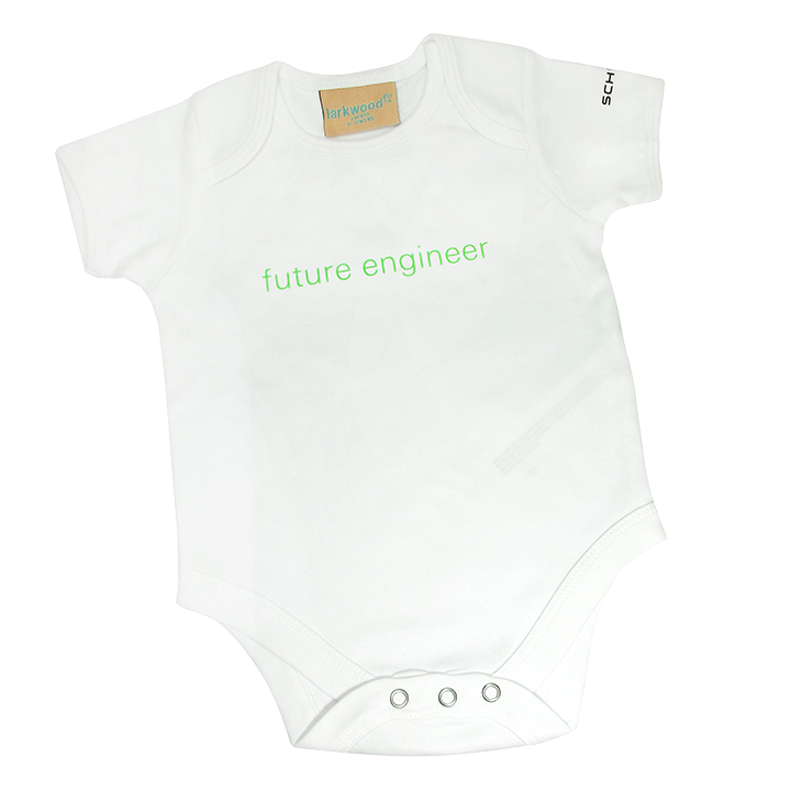 "Schüco babies" should have this: a white baby body with a green "future engineer" print and a black Schüco logo on the sleeve.